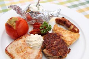 - Gebratene Pouletbrust garniert mit frischen Salaten